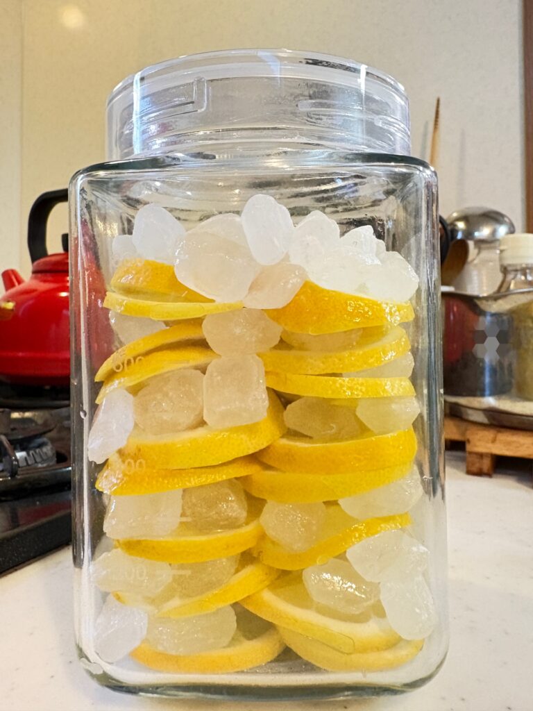 - 瓶に交互に詰める 煮沸消毒した清潔な瓶に、「レモン→砂糖→レモン…」の順で重ねて入れます。